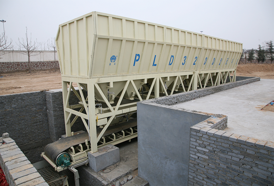 PLD3200配料機有四個20m3儲料倉,可儲存四種骨料。儲料倉內(nèi)的砂石從各儲料倉底部料門卸入四個秤斗中進行稱量;稱量完畢后通過水平皮帶機輸送至斜皮帶機,過沖量自動修正,欠秤自動補償,稱量精準。