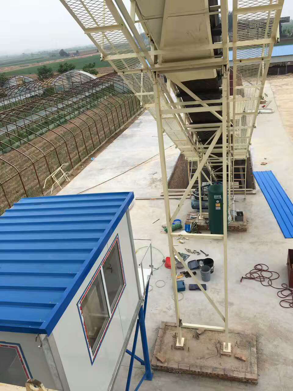 整套攪拌站在一片寬闊的水泥地面上安裝,水泥倉,攪拌主機,配料機,控制室,輸送裝置,料斗,從西到東,整排下來,一氣呵成,顯得干凈利索毫不拖沓。