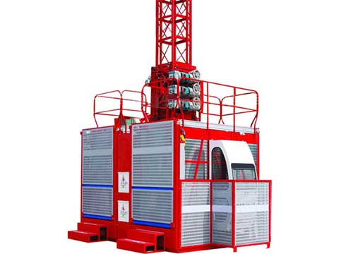SC200型施工升降機(jī)表示由齒輪、齒條傳動、傳動機(jī)構(gòu)在吊籠頂部,載重亮為2000kg,且無對重的雙吊籠施工升降機(jī)。