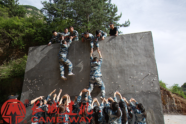 “畢業(yè)墻”也叫逃生墻、勝利墻、海難逃生。是一個靠集體力量才能完成的項目,一個讓員工們懂得個人目標與團隊目標的關(guān)系的項目,提高團隊協(xié)作能力、凝聚力。要合理的安排人力資源,用科學(xué)的方法解決問題;自覺奉獻,用于吃苦;正確面對人生和工作中遇到的困境和坎坷;向共同的目標沖刺。